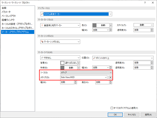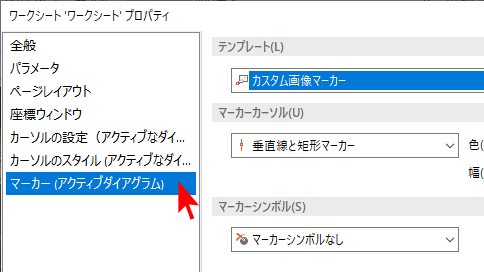 「マーカー (アクティブダイアグラム) 」タブをクリックします。(訳注:テンプレートに「カスタム画像マーカー」を選択します)