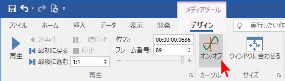 次に「メディアツール」のデザイン [カーソル] > オン/オフ をクリックしてカーソルを表示します。