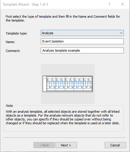 - テンプレートウィザードが開きます。フォルダーまたは複数のオブジェクトがすでに選択されているため、FlexPro はテンプレートの種類に「解析」を自動的に選択します。選択したフォルダーの名称がテンプレートの「名前」として使用され、フォルダーのコメントがテンプレートの「コメント」として使用されます。このテンプレートの種類またはテンプレートの名前は変更しないでください。「コメント」フィールドに「解析テンプレート例」と入力します。「次へ」をクリックします。