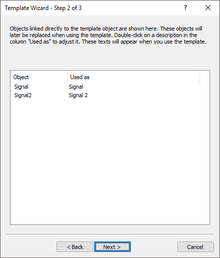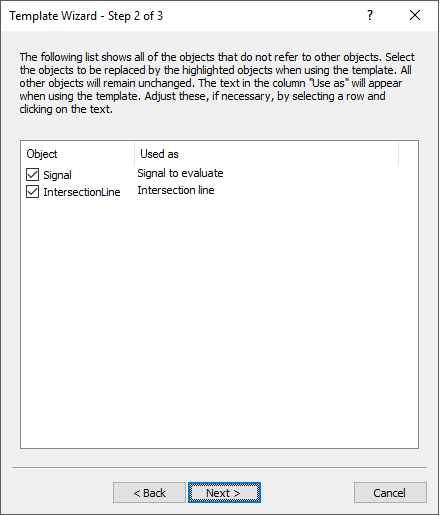 - 「用途」列では、テンプレートの使用時に表示するテキストを変更できます。Signal オブジェクトには「評価対象のシグナル」というテキストを入力し、IntersectionLine オブジェクトには「交点の線」と入力します。「次へ」をクリックします。