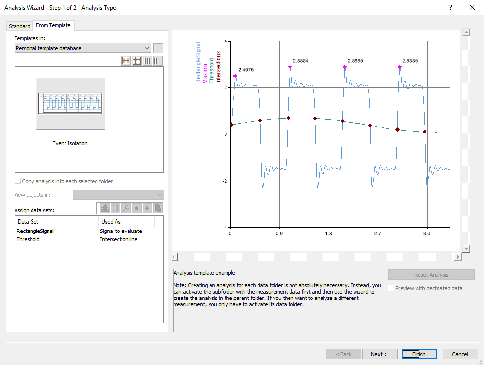 - ここで、挿入 [解析] > 解析ウィザード >「テンプレートを使用する」を選択します。解析ウィザードが開きます。
