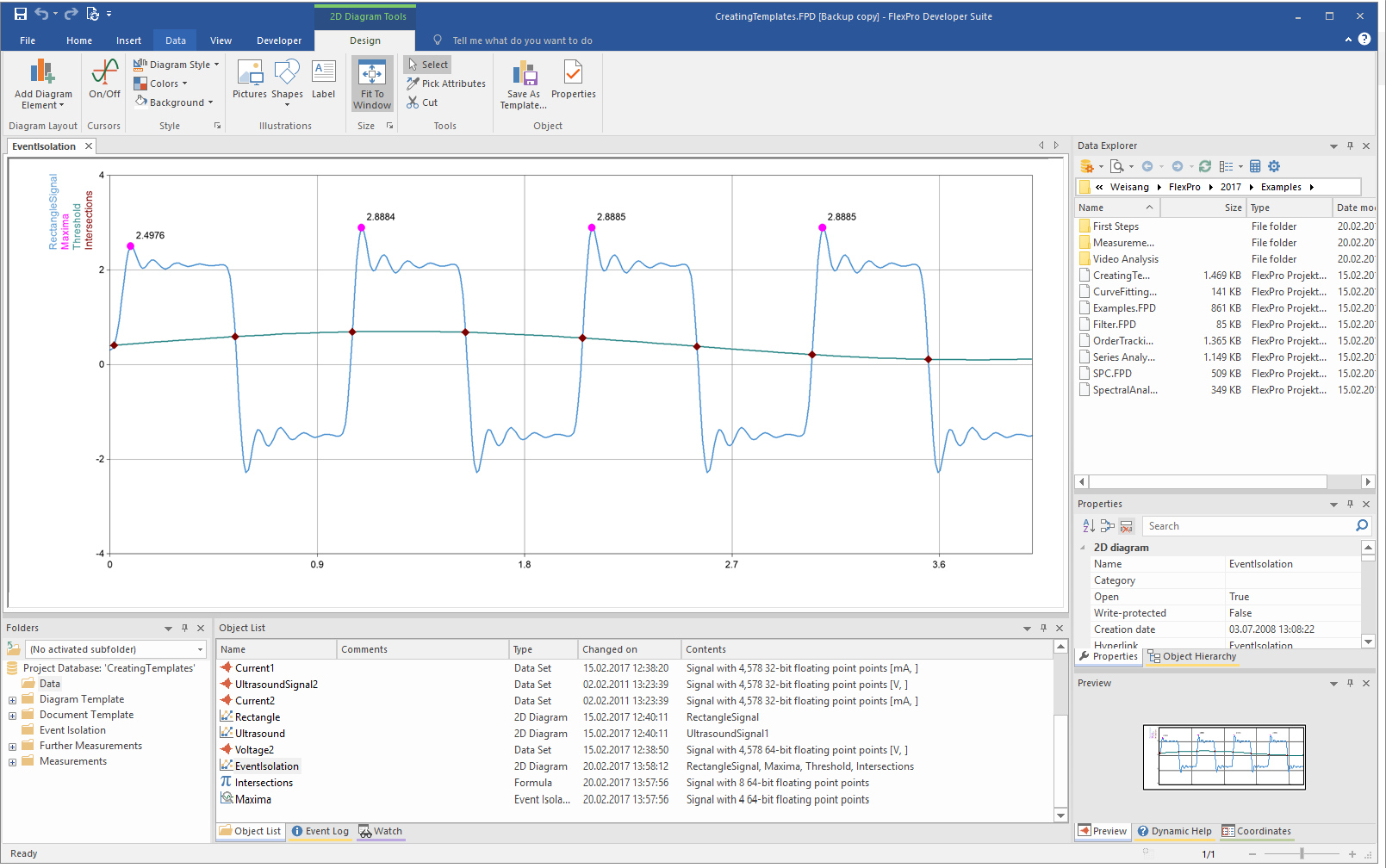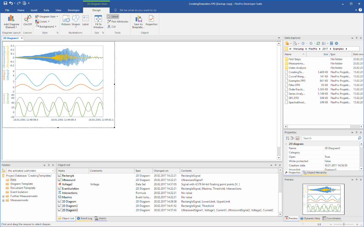 - Data フォルダーで、オブジェクト Voltage1、Voltage2、Current1、Current2、UltrasoundSignal1、UltrasoundSignal2 を選択し、挿入 [ダイアグラム] > ダイアグラムウィザード >「テンプレートから」を選択します。