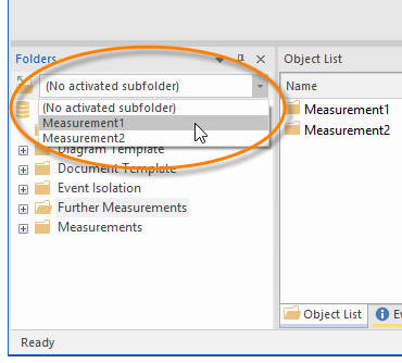- 「フォルダ」ウィンドウの上部にある「アクティブ化されたサブフォルダー」のリストボックスからフォルダー Measurement1 を選択します。または、フォルダー Measurement1 を右クリックして、コンテキスト メニューからコマンド「フォルダのアクティブ化」を選択することもできます。