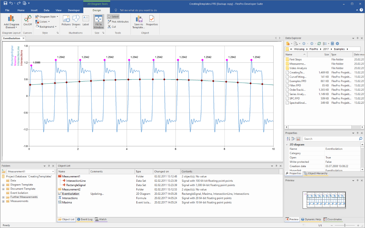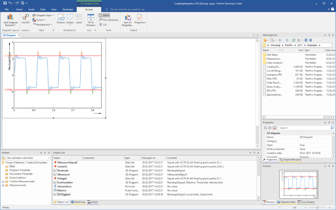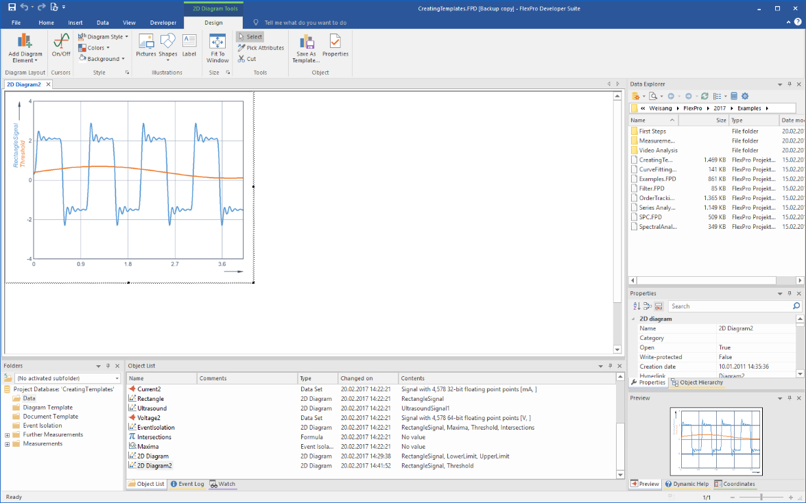 FlexPro のテンプレートを使用すると、作成した解析結果やプレゼンテーションを必要なときに何度でも再利用できます。ここに紹介する例では、解析、ダイアグラム、ドキュメントのテンプレートを作成する方法と、各種テンプレートを使い分ける方法を示します。