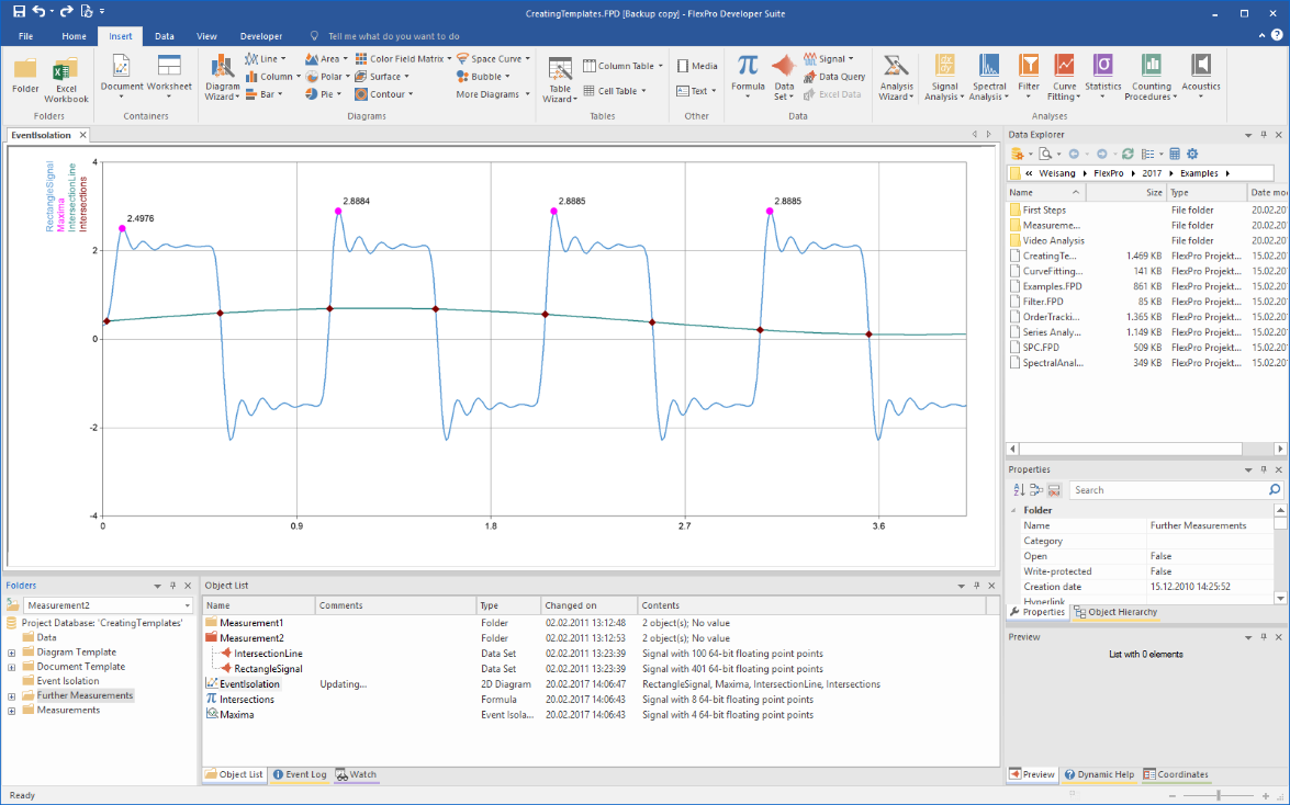 - Data フォルダで、RectangleSignal、UpperLimit、LowerLimit オブジェクトを選択し、挿入 [ダイアグラム] > ダイアグラム ウィザード > 「テンプレートから」を選択します。