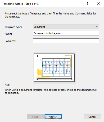 - Diagram3 という 2D ダイアグラムを選択し、ホーム [選択したオブジェクト] > 「テンプレートとして保存」 を選択します。テンプレートウィザードが開きます。
