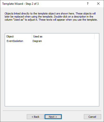 - 「用途」列では、テンプレートの使用時に表示されるテキストを変更できます。EventIsolation オブジェクトの場合は、「ダイアグラム」というテキストを入力します。「次へ」をクリックします。