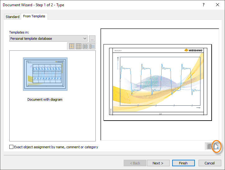 解析テンプレートとは対照的に、ドキュメントテンプレートにはいずれも常に1つのドキュメントしか含まれません。したがって、それはドキュメントへの直接リンクであり、選択したオブジェクトに置き換わる最下層レベルのオブジェクトではありません。これらはすべて、オブジェクト階層でドキュメントよりも1レベル階層が低いオブジェクトです。たとえば、ドキュメントの内容が 2D ダイアグラムのリンクである場合、テンプレートがロードされると、2D ダイアグラムは選択された 2D ダイアグラムに置き換わります。もし、そのドキュメントに、カーブとしてシグナルを含む埋め込み 2D ダイアグラムが含まれている場合、そのシグナルは選択されたオブジェクトに置き換わります。