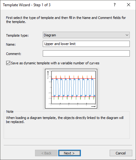 - 「テンプレートの種類」として「ダイアグラム」を選択し、名前に「上限と下限」と入力します。「カーブの数が変動するダイナミックテンプレートとして保存する」オプションを無効にします。「次へ」をクリックします。