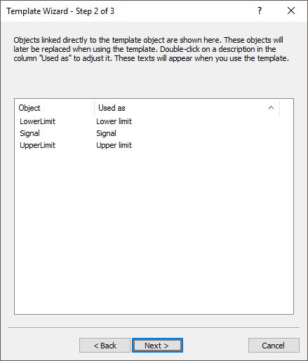 - 「用途」列では、テンプレートの使用時に表示されるテキストを変更できます。UpperLimit オブジェクトの場合は「上限」、Signal オブジェクトの場合は「シグナル」、LowerLimit オブジェクトの場合は「下限」と入力します。「次へ」 をクリックします。