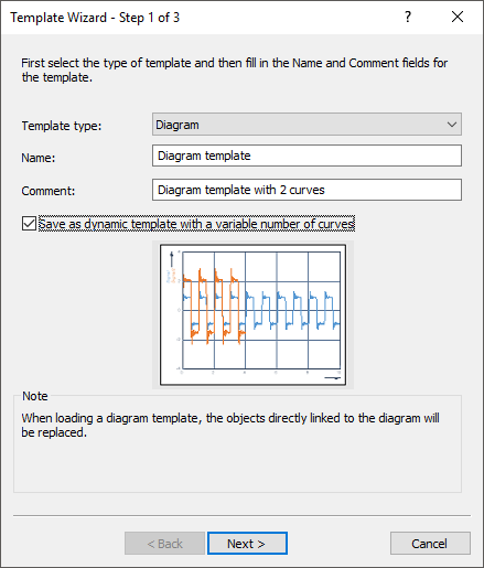 - 「テンプレートの種類」として「ダイアグラム」を選択し、名前として「ダイアグラムテンプレート」と入力します。コメントには、「2つのカーブを含むダイアグラムテンプレート」というテキストを入力します。