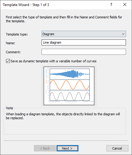 FlexPro では、ダイアグラムテンプレートを静的と動的に区別しています。動的テンプレートを使用すると、選択したデータセットに応じてカーブが作成されます。静的テンプレートでは、既存のカーブのみが選択したデータオブジェクトにリンクされます。余分なデータオブジェクトが存在する場合は無視されます。テンプレートの種類は、保存時に定義します。