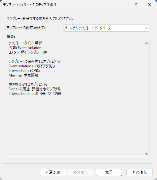 - ウィザードの最後のページに進みます。テンプレートの保存場所を「パーソナルテンプレート データベース」に指定します。「完了」をクリックします。