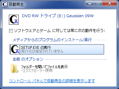 Gaussian 09W のインストール CD を PC に挿入します。以下のダイアログが表示されたら、「