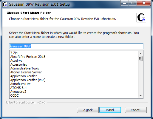 スタートメニューに表示されるショートカットの名前を指定します。デフォルトは Gaussian 09W です。変更の必要がなければ、そのまま 「