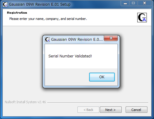 (アップデートの場合のみ)以前のリビジョンの Gaussian 09W が検出されると、以下のダイアログが表示されます。「