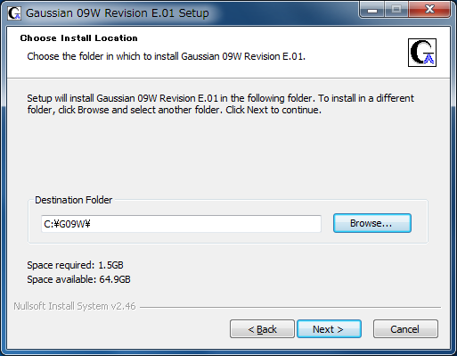インストール先ディレクトリを指定します。デフォルトは C:\Gaussian 09W です。変更の必要がなければ、そのまま 「
