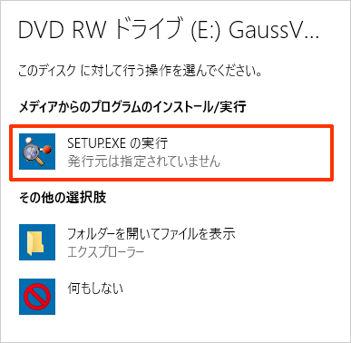 GaussView W 6 のインストールメディアを PC に挿入します。自動再生で、下図のように画面が表示されたら「SETUP.EXE の実行」を選択します。