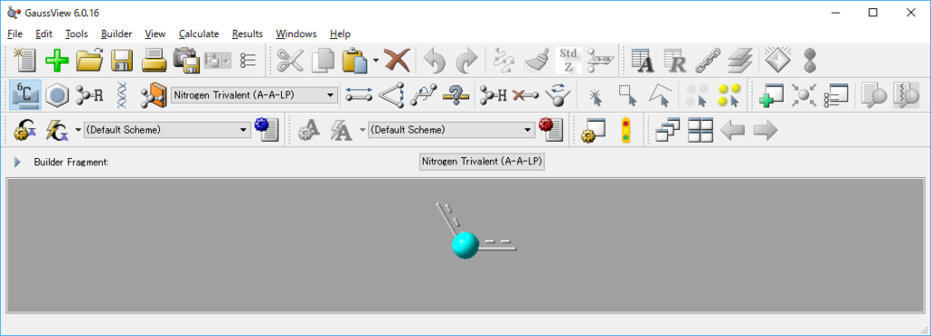 分子はビューウィンドウの中に表示され、変更ができます。メインツールバーの下のビルダーフラグメント表示エリアとビューウィンドウを混同しないようにご注意ください。ビルダーフラグメント表示エリアは、次にクリックしたときに現在の分子になにが追加されるかを示しています。