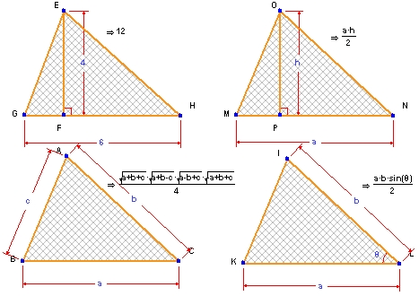 以下に示す左上の図は、底辺が 6、高さが 4 の三角形です。この面積を学生に求めさせます。その結果、答えは 12 と返ってきます。この点を学生が動かすと、状況は動的に変化します。図形の変化に伴って領域も変化するわけです。しかし、入力内容と出力結果はいずれも数値です。数学的に証明される結果は何もありません。Geometry Expressions なら数学的証明を簡単に行うことができます。しかし、Geometry Expressions にできることはこれだけにとどまりません。