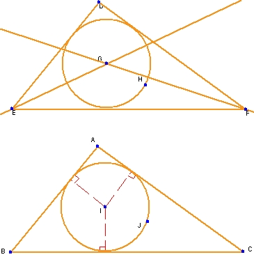 Geometry Expressions では、作図と条件の両方がサポートされます。以下の図は、これら2つのアプローチの違いを分かりやすく説明する簡単な例を示したものです。上の図は、はじめに角の二等分線を2つ描画して内接円を作成します。その後、これら2つの直線の交点に点を配置し、この点を円の中心とします。そして、作成した円をその周囲が三角形の辺と接するところまでドラッグするか、点 G と一辺までの距離を数値的に測定し、得られた値を円の半径に設定します。以上の工程を経て求める円が作図されます。作図によるアプローチは、内接円とは何かをはじめて学ぶ人にとっては非常に役立つ手段です。しかし、内容が分かってくると、こうした作業が面倒に感じられるようになります。2つめの例は、円を描画したあと、その円と三角形の1辺を選択し、円と三角形の辺が接するように条件をあたえたものです (各辺について順番に繰り返す)。これだけで出来上がりです!