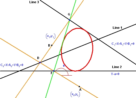 θ が変化すると、この直線も動きます。これらの直線の包絡線は以下の赤で示す円錐曲線となります。この円錐曲線は、前の例で最初の3つの点と2つの直線で定められたものと同様、最初の3つの直線と2つの点によって定まります。これらの直線と点が変わると、円錐曲線の包絡線全体も変わります。