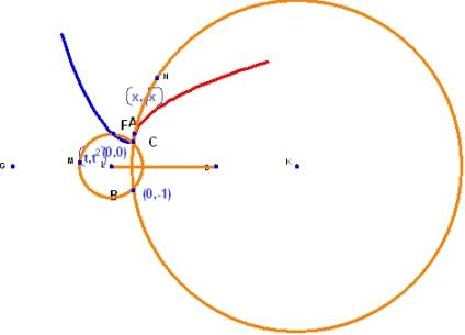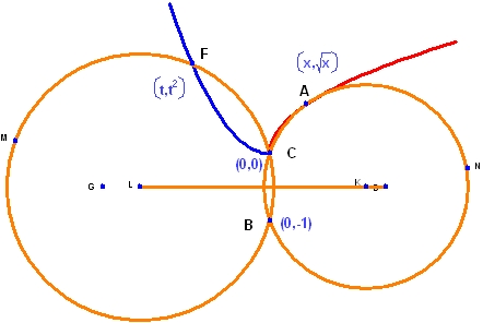 円のひとつを A, B, C で定義し、もうひとつの円を B, C, F で定義します。A を曲線 y=√x 上の点とし、F を曲線 y = x2 上の点とします。点 F と A をそれぞれ独立して変化させることができるように、ここでは、2つ目の曲線のパラメータに t を使用しています [Geometry Expressions では、直交座標系の変数に大文字の X と Y が使用されます。ここでは、小文字の x を A を通過する曲線のパラメータとして使用しています]。