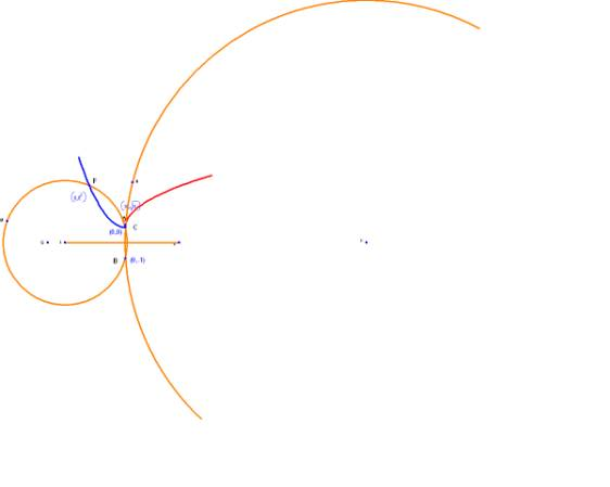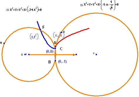 ここで、t をゼロに近づければ、F を通過する円が中心を (0,1/2) とする円に近づくことが分かります。一方、x をゼロに近づける場合は、A を通過する円が Y 軸に近づくのが分かります。