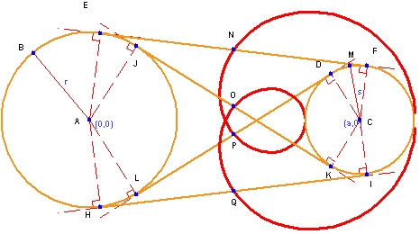 この例で検討するのは、2つの円の共通接線の中点の軌跡です。作成された図は一見非常に複雑なものに見えますが、Geometry Expressions なら作図と条件をうまく組み合わせることで非常に簡単に作成することができます。2つの円を描画したら、半径の条件に “r” と “s” をそれぞれ設定します。次に4つの共通接線を作成します。直線を単純に引き、2つの円それぞれに接するよう条件を与えます。次に、作図機能を使って、各直線に4つの中点を作成します。最後に、各中点を選択し、半径 r の変化に伴ってできる軌跡を求めます。