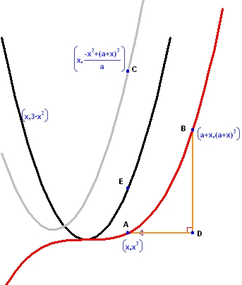 関数 f(x) を x3 とします。2つの点の座標を (x,f(x)) と (x+a,f(x+a)) とし、Δy と Δx を示す直角三角形を描画します。作成したグラフは関数 f(x) (赤線) とその導関数 3x2 です。灰色であらわされている関数は (f(x+a) – f(x))/a です。ここで、パラメータ a を動かすと、Δy と Δx 、および、灰色のグラフの両方が変化するのを確認できます。パラメータ a の値を小さくするほど、灰色のグラフが黒のグラフに近づいてゆくのを確認できるはずです。すなわち、a がゼロに向かう極限を考える場合、点 B は点 A に向かって移動し、灰色のグラフ (導関数の近似式) は黒のグラフ (実際の導関数) に向かって移動することを、これであらわすことができます。