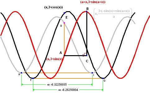 微分を極限で説明するもうひとつの例として、関数 3sin(x) を取り上げます。前回の例と同様に、関数 3sin(x) の導関数 (3cos(x)) とその近似式 (灰色で表示) を描画します。ここでも、パラメータ a をゼロに向けて動かしてゆくと、灰色の曲線が実際の導関数 (黒の曲線) に向かって移動します。初歩の学生にとって、この導関数の近似式は元の関数を縮尺し、平行移動しただけにしか見えないかもしれませんが、実際はそうではありません。このことを証明するために、各グラフで連続してあらわれる最小値間の距離が同一ではないということをハイライトで表示してあります。
