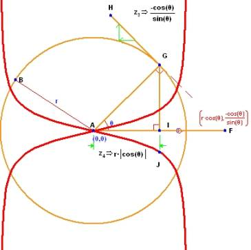 ここで、x と t がゼロに近づくにつれて、A と F は C に重なる点に注意してください。ゼロの位置までくると、2つの円の定義が消滅します。どちらの円も区別できない3点では定義していませんが、果たして、この極限における2つの円は、本当に矛盾なく定義されているのでしょうか?