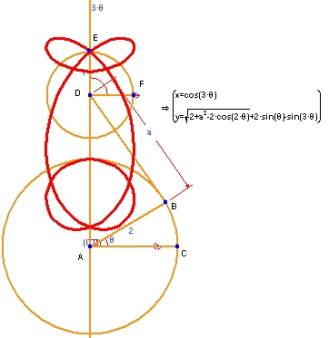 この例では、中心を A とする半径 2 の円周上に点 B を配置します。AB と水平線 AC がなす角を θ とします。θ をこのアニメーションのパラメータとします。点 D が A を通過する垂直線上に配置されるよう条件を与え、BD の距離を a とします。D を中心とする単位円の円周上に点 E を配置し、DE と水平線 DF がなす角を 3θ とします。これにより、θ の変化に応じて、点 D は垂直線を上下にスライドし、点 E は単位円の周囲を点 B が中心を A とする円の周囲を回転する 3倍の速さで回転することになります。赤で示したのは、点 E が描く軌跡です。なお、この軌跡に加えて、Geometry Expressions でそのパラメトリック方程式を θ と a を使って求めている点も注目してください。