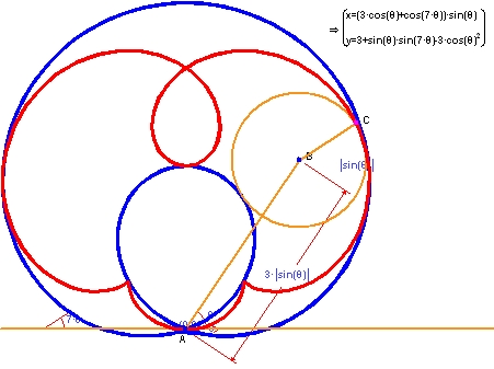 この図では、点 B を中心とする円の周囲に点 C を配置しています。ただし、AB と水平線がなす角を θ とし、AB の長さを 3 sinθ、円の半径を sinθ としている点に注意してください。これにより、θ の変化に応じて、円の半径と点 A との距離の両方が変化することになります。赤の曲線は点 C の軌跡、青の曲線はこの円の包絡線です。なお、ここでは赤の曲線のパラメトリック方程式を求め、その数式が出力されている点についても注目してください。