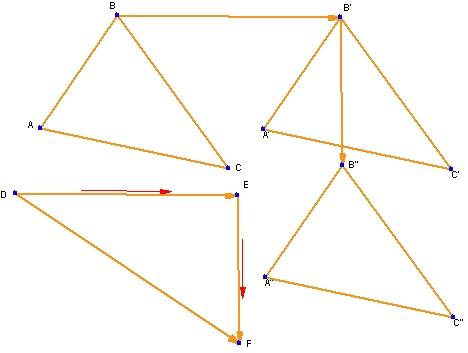 この例も、シカゴ大学学校数学プロジェクトの『代数学』 (Scott, Foresman) からの引用です。この教科書では、この問題を座標を使って解いています。Geometry Expressions でも座標を使うことはできますが、その必要はありません。以下の図では、三角形 ABC の位置をスライドベクトル BB’ で定義した別の位置にスライドさせ、その後、B” にスライドさせています。この2つのスライドベクトルを追加することで、DF によって定義される単一のスライドの効果を調べることができます。