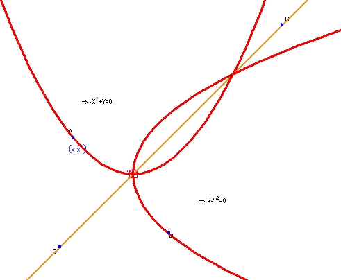 この図は、直線 y = x を軸とする曲線 y=x2 の鏡映を示すものです。Geometry Expressions では、鏡映、併進、および、伸縮操作を実行することができます。