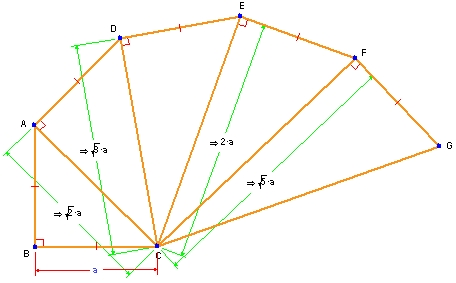 この例は、教科書では、以下の図に示す三角形が最初の2つのみ示され、辺 BC の値には “3” が指定されています。出題されている問いは DC の長さを求めることです。三角形をさらに作成してゆくと状況は複雑になり、特定の数値を使用することでパターンが分からなくなってしまうでしょう。Geometry Expressions では、数式の使用が可能であることに加え、この流れで更に幾つかの三角形をシンプルで迅速に描画することができます。n 番目の斜辺が (n+1)1/2 であることは、これにより容易に理解できます。