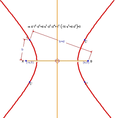 この例は、円錐の断面を元に作成したもので、その中でも、固定された2つの点からの距離の差が一定となるような2つの点の軌跡として定義された双曲線をあらわすものです。以下の図は、固定する2つの点を A および B とし、変動する点を C としたものです。CA と CB の距離の差を一定の値 d とします。Geometry Expressions を使えば (他の動的幾何システムとは異なり)、これらの距離を数式であらわすことができます。システムによってその軌跡 (双曲線) を作成できるだけでなく、その方程式を求めることもできます。