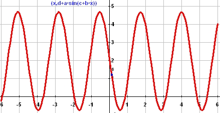 これは、関数 a*sin(b*x+c) + d を示したものです。振幅、周波数、位相シフト、オフセットなど、学生がこのパラメータのいずれかを動的に変更すると、それに応じて変化する内容を即座にグラフ上で確認することができます。