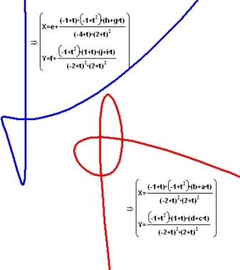 上の図で赤の曲線と青の曲線はいずれも有理4次式です。座標がシフトしている点を除けばパラメータ化された式はどちらも同じだからです。2つの曲線の間にある表示上の違い (実平面上で赤の曲線には3つの重複点があるのに対して、青の曲線には重複点が1つしかない) は、係数 a, b, c, d, g, h, i, および j の選択が違うだけです。