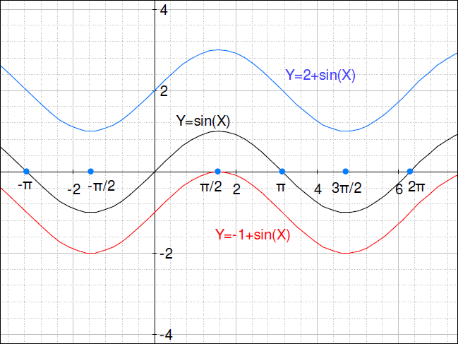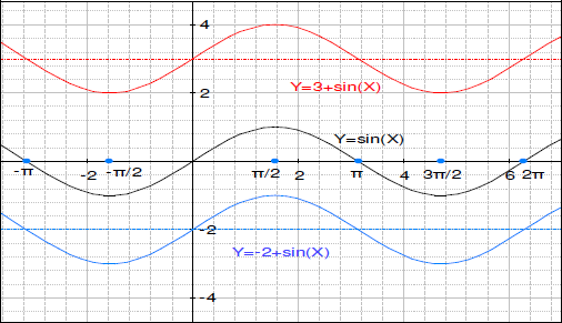 1.関数 y = sin (x) のグラフがあります。同じ軸で、y = sin (x) + 3 のグラフを描いてください。