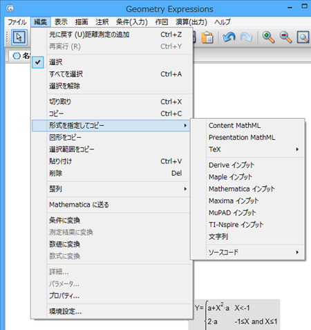 サブメニューを選択すると、選択された数式が Windows のクリップボードにコピーされ、それぞれ該当するアプリケーションにその内容を貼り付ける (Ctrl+V) ことができます。