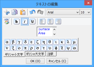 このダイアログで使用するテキストの書式の初期設定は、編集 > 環境設定 > テキストと画像 で設定します。