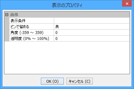 では、画像を任意の描画オブジェクトと共に移動させることができます。挿入された画像は、表示のプロパティダイアログボックスでその回転角度と透明度を設定することができます。