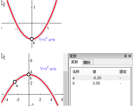 ・ハンドルを使って関数をインタラクティブに編集できます。描画ウィンドウで、関数をクリックして選択状態にします。マウスをクリックして、ドラッグすると曲線上に円が表示されます。このハンドルは方程式の変数の1つを表しています。このハンドルは図形の周りをクリック&ドラッグすることができます。関数の別の場所をクリック&ドラッグすると、方程式に別の変数があれば、もうひとつ別の可動ハンドルが表示されます。