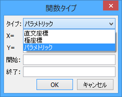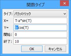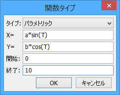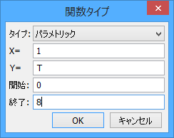 関数タイプダイアログからパラメトリックを選択すると、次の行にはパラメータを T とする X および Y についての関数の一般式が入ります。