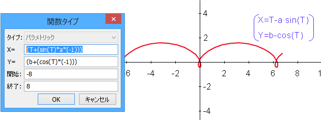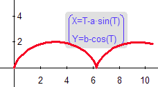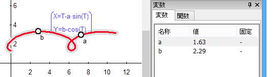 上の例 X=T-a*sin(T), Y=b-cos(T) では、マウスをクリック&ドラッグすると b ハンドルがあらわれ、これを使って関数を上下にドラッグすることがます。曲線上の別の位置をクリック&ドラッグすると、a ハンドルが表示され、これを使えば曲線の形状を変更することができます。
