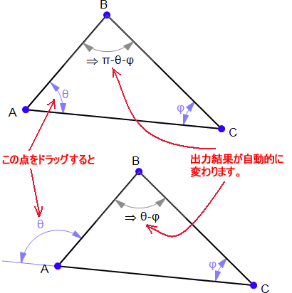 要求した演算対象が角またはその補角のいずれか判然としない場合、角度記号をドラッグすることで、それを正しい位置に直すことができます。