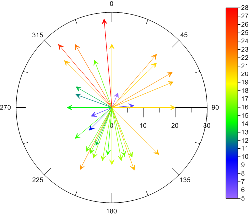 極座標プロットは、角度と半径の値を使ってデータをプロットするものです。極座標系に作成できるベクトルプロットは2種類あります:始点から指定した距離で指定した角度に進む1点ベクトルと、2点をつなげた2点ベクトルです。極座標ベクトルプロットと他の極座標プロットとを組み合わせることで、最適な表現でグラフを作成することができます。極座標プロットでは、ラインカラーや矢印スタイルを含むすべての側面を変更することができます。