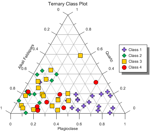 三角ダイアグラムを作成すると、任意の3つの変数が 100% に正規化されて表示されます。このデータに分類散布図としてのデータを表示させることで第4の変数が加わります。ラインで点をつなげたり、ラベルを追加したり、その他、グラフの任意の部分を編集することができます。テキスト列や数値列を使ってクラスを作成することで、お持ちのデータを最も分かりやすくあらわすことができます。